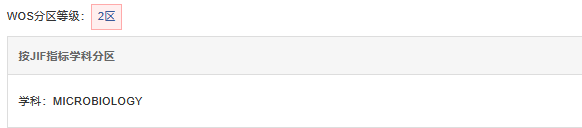 WOS分區:2022-2023年最新版中,WOS分區等級為2區。按JIF指標,在“MICROBIOLOGY”學科中位于Q2區,JIF排名53/135,百分位61.1%,屬于微生物學領域的中上水平。