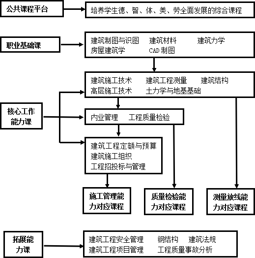 通過直接面對(duì)企業(yè)的調(diào)查問卷,確定了企業(yè)對(duì)畢業(yè)生就業(yè)崗位需求狀況,按需求比例依次是施工員、質(zhì)檢員、造價(jià)員、測(cè)量員、材料員、安全員、資料員、試驗(yàn)員。由于我院工程造價(jià)專業(yè)主要培養(yǎng)造價(jià)員,所以建筑工程技術(shù)專業(yè)主要培養(yǎng)除造價(jià)員以外需求比例前三的施工員、質(zhì)檢員、測(cè)量員。本次調(diào)研以鋼筋混凝土高層結(jié)構(gòu)為例,確定了施工員、質(zhì)檢員、測(cè)量員職業(yè)崗位為核心的典型事件任務(wù),分析歸納了施工員、質(zhì)檢員、測(cè)量員的行動(dòng)領(lǐng)域,進(jìn)而初步確定學(xué)習(xí)領(lǐng)域,根據(jù)課程的前后關(guān)系,確定建筑工程技術(shù)專業(yè)課程體系示意圖如圖1所示。