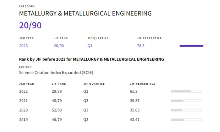 影響因子為3.1,位于Metallurgy & Metallurgical Engineering學(xué)科類別Q1區(qū)(第20/90名),同比去年增長24%。