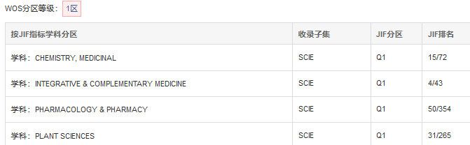 根據(jù)JCR分區(qū),與其他領域的期刊相比,該期刊在全科醫(yī)學與補充醫(yī)學領域的63本期刊中排名第17,屬于Q2區(qū);在藥學領域的30本期刊中排名第4,屬于Q1區(qū);在植物科學領域的279本期刊中排名第71,屬于Q2區(qū);在藥物化學領域的239本期刊中排名第31,屬于Q1區(qū)。