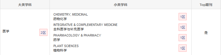 在中科院分區(qū)中,該期刊屬于大類學科醫(yī)學2區(qū),小類學科中的全科醫(yī)學與補充醫(yī)學、藥學、植物科學為1區(qū),而藥物化學為2區(qū)。