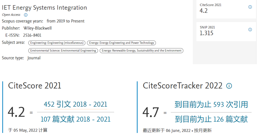 值得一提的是,IET Energy Systems Integration的2021 CiteScore高達4.2,SNIP 1.315,并且仍在持續上漲中。