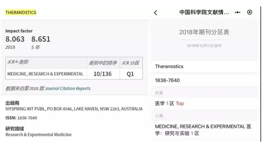 Theranostics雜志是由 Ivyspring International出版商發(fā)行,于2011年創(chuàng)刊,比Journal of Cancer遲一年。目前JCR分區(qū)為醫(yī)學(xué)研究與實(shí)驗(yàn)1區(qū),中科院分區(qū)為醫(yī)學(xué)1區(qū)。在136本同類別SCI期刊中,Theranostics排名第10。