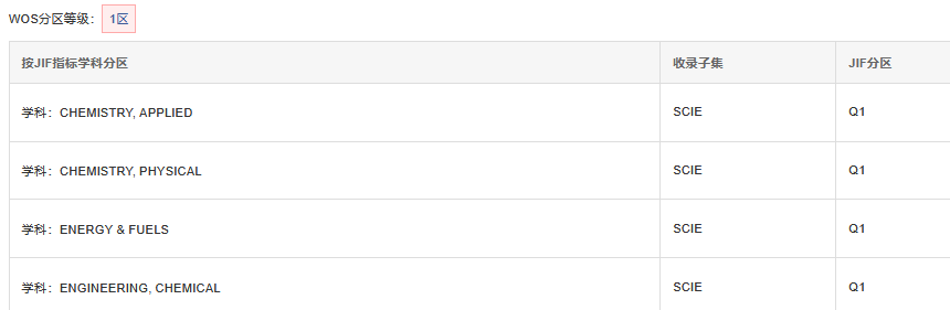 中科院分區:大類學科“化學1區TOP”,小類學科“應用化學”1區、“能源與燃料”1區。