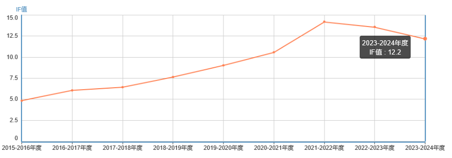 2024年最新影響因子為 12.2,較上一年下降1.4,但仍保持環境領域頂刊地位。歷史數據顯示其IF從2015年的5分左右快速增長至2022年的14.2,近年雖小幅波動,但整體呈上升趨勢。