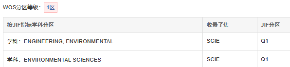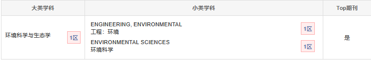 中科院分區:大類“環境科學與生態學1區TOP”,小類“工程:環境1區”“環境科學1區”。