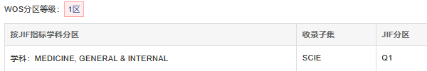WOS分區(qū):2023 2024年最新版中,WOS分區(qū)等級(jí)為1區(qū)。按JIF指標(biāo)學(xué)科分區(qū),在“MEDICINE, GENERAL & INTERNAL”學(xué)科中處于Q1區(qū),JIF排名57/329,JIF百分位82.8%;按JCI指標(biāo)學(xué)科分區(qū),同樣在“MEDICINE, GENERAL & INTERNAL”學(xué)科中處于Q1區(qū),JCI排名69/333,JCI百分位79.43% ,在WOS分區(qū)體系中表現(xiàn)較好。