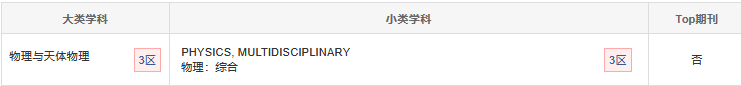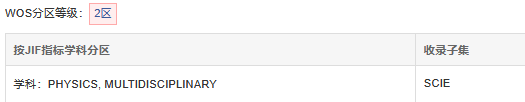 WOS分區(qū):2023 - 2024年最新版中,WOS分區(qū)等級為2區(qū)。按JIF指標(biāo)學(xué)科分區(qū),在“PHYSICS, MULTIDISCIPLINARY”學(xué)科中處于Q2區(qū),JIF排名37/112,JIF百分位67.4%;按JCI指標(biāo)學(xué)科分區(qū),在“PHYSICS, MULTIDISCIPLINARY”學(xué)科中處于Q2區(qū),JCI排名32/112,JCI百分位71.88% ,在WOS分區(qū)體系中處于中等位置。