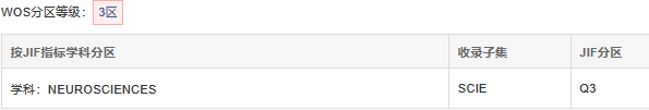 WOS分區:2023 - 2024年最新版中,WOS分區等級為3區。按JIF指標學科分區,在“NEUROSCIENCES”學科中處于Q3區,JIF排名187/310,JIF百分位39.8%;按JCI指標學科分區,在“NEUROSCIENCES”學科中處于Q3區,JCI排名212/310,JCI百分位31.77% ,在WOS分區體系中處于中等偏下位置。