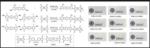 近日,團(tuán)隊(duì)采用鈀催化的溴代苯胺與降冰片二烯環(huán)化反應(yīng),合成了含降冰片基-苯并環(huán)丁烷結(jié)構(gòu)的(N2BC)二胺(CANAL-2和CANAL-4),并成功分離了CANAL-4的立體異構(gòu)體;利用上述二胺和商品化二酐合成了一系列CPIs,剛性扭曲N2BC部分賦予CPIs極高的Tg(418-480℃)、較低的線膨脹系數(shù)(23.9-66.2ppm K-1)以及良好的光學(xué)性能(T400nm為61%-84%),相關(guān)成果發(fā)表在Polymer Chemistry(DOI: 10.1039/D2PY00833E)上,申請(qǐng)中國發(fā)明專利1件(202110619524.9)。