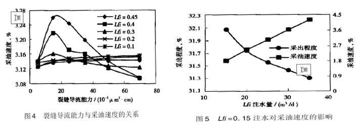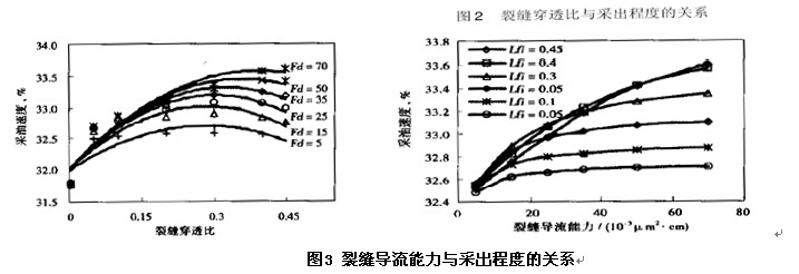 圖2 和圖3 分別為含水率達(dá)到95% 時(shí)的裂縫穿透比及裂縫導(dǎo)流能力與采出程度的關(guān)系曲線。在裂縫導(dǎo)流能力一定的情況下,采出程度隨裂縫穿透比增加先增加后又逐漸減少,以采出度為優(yōu)化目標(biāo)存在最佳的裂縫穿透比。裂縫穿透比過低達(dá)不到好的壓裂效果,同時(shí)裂縫穿透比過高,生產(chǎn)井見水后含水率上升很快,導(dǎo)致最終采出程度降低。在采油速度與裂縫穿透比的曲線也出現(xiàn)了明顯的拐點(diǎn),綜合考慮采出程度及采油速度,研究區(qū)域最佳裂縫穿透比取0.3。在裂縫穿透比一定的情況下,采出程度隨裂縫導(dǎo)流能力的增加而增加,但其增加幅度減少。