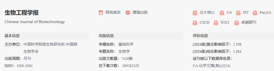 《生物工程學報》是一本由中國科學院主管、中國科學院微生物研究所和中國微生物學會主辦的綜合性期刊,創刊于1985年。期刊不僅是CSCD核心,也同時是北大核心期刊、中國科技核心期刊,具有較高的學術水平,影響因子為2.198.