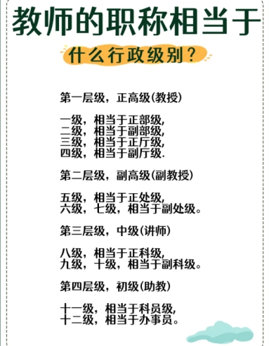 正高級(教授):一級職稱類比于省部級正職,二級對應副部級,三級與廳局級正職相當,四級則參照廳局級副職。