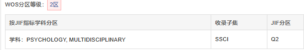 WOS分區(qū):2023-2024年最新版中,WOS分區(qū)等級為2區(qū)(SSCI收錄)。按JIF指標(biāo),在“PSYCHOLOGY, MULTIDISCIPLINARY”學(xué)科中位于Q2區(qū),JIF排名56/219,百分位74.7%。