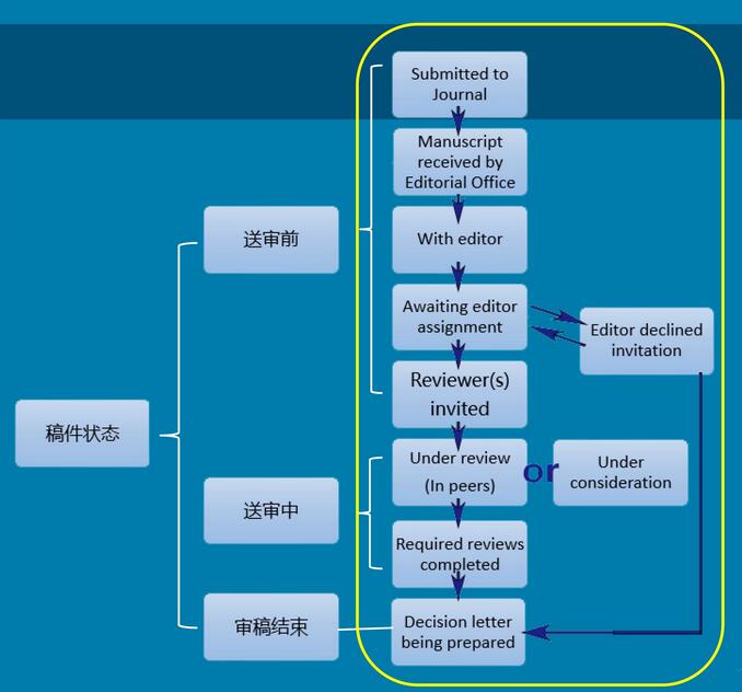 3.1 Awaiting Editor Assignment 指派責任編輯Editor assigned,是指把稿件指派給別的編輯。 3.2 Editor Declined lnvitation 此狀態表明之前找的那個編輯太忙,正在聯系其他編輯。如果編輯接手了就會開始邀請審稿人了。 |